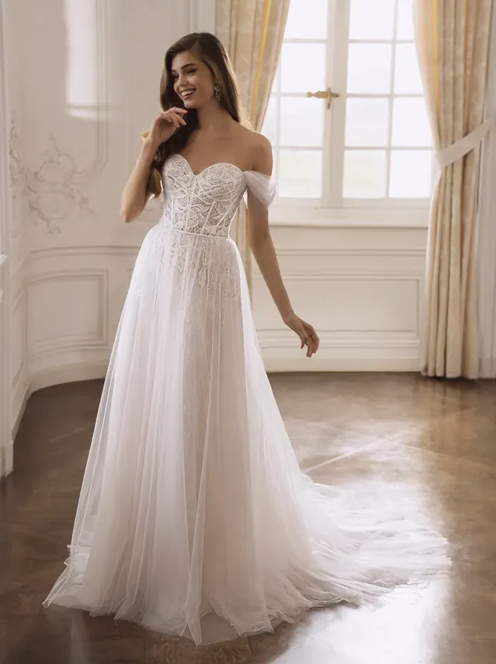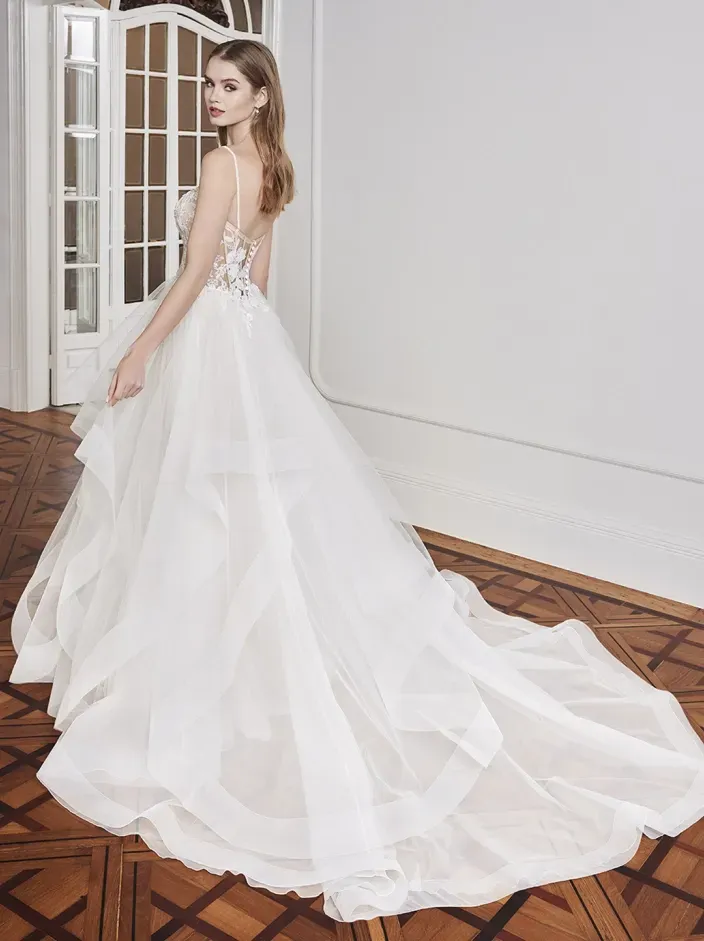 ÉLYSÉE Bridal draws inspiration from European artistry and architecture, resulting in gowns that combine delicate romance with confident structure. Known for its flattering construction and intricate lacework, the collection emphasizes shape-enhancing silhouettes paired with thoughtful detailing.