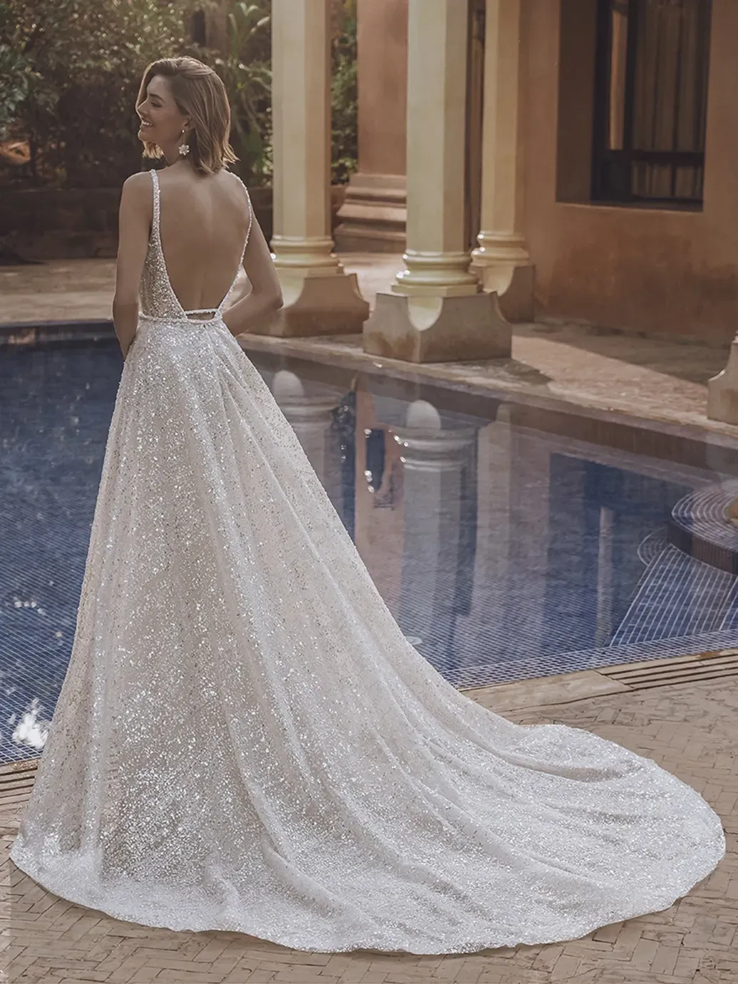 Enzoani blends European-inspired design with contemporary structure, resulting in gowns that feel bold, refined, and undeniably flattering. The brand is especially recognized for its expertly constructed fit-and-flare silhouettes, illusion details, and statement trains.