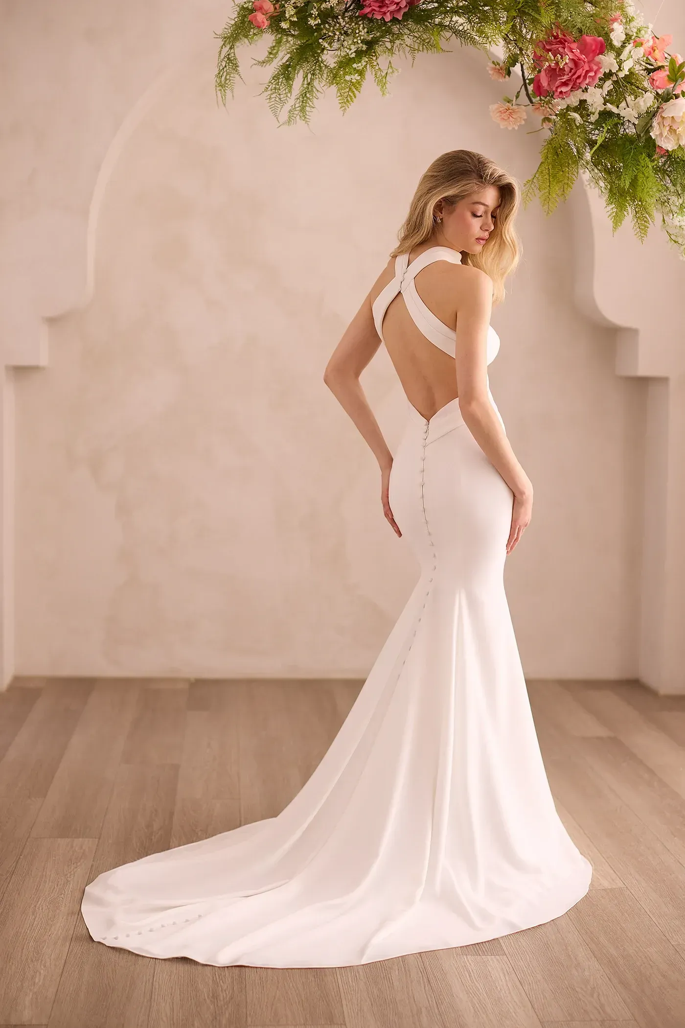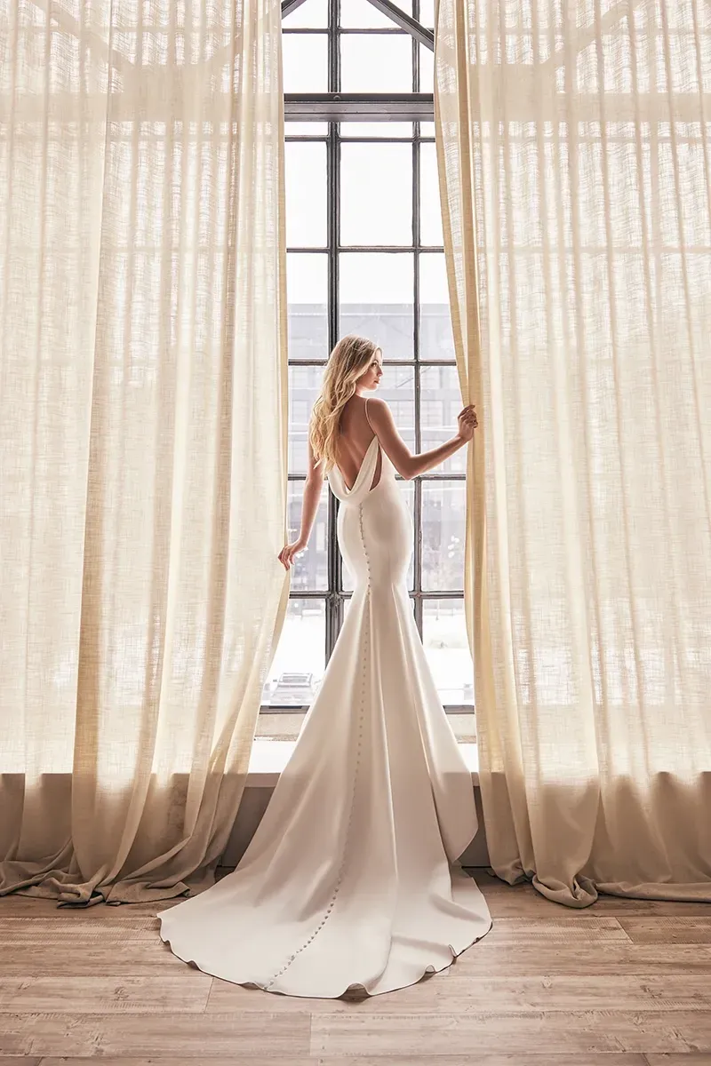 Mikaella Bridal, part of the Paloma Blanca family, is known for its clean aesthetic and thoughtful construction. The collection emphasizes modern silhouettes, luxurious fabrics, and minimal embellishment, allowing shape and tailoring to take center stage.